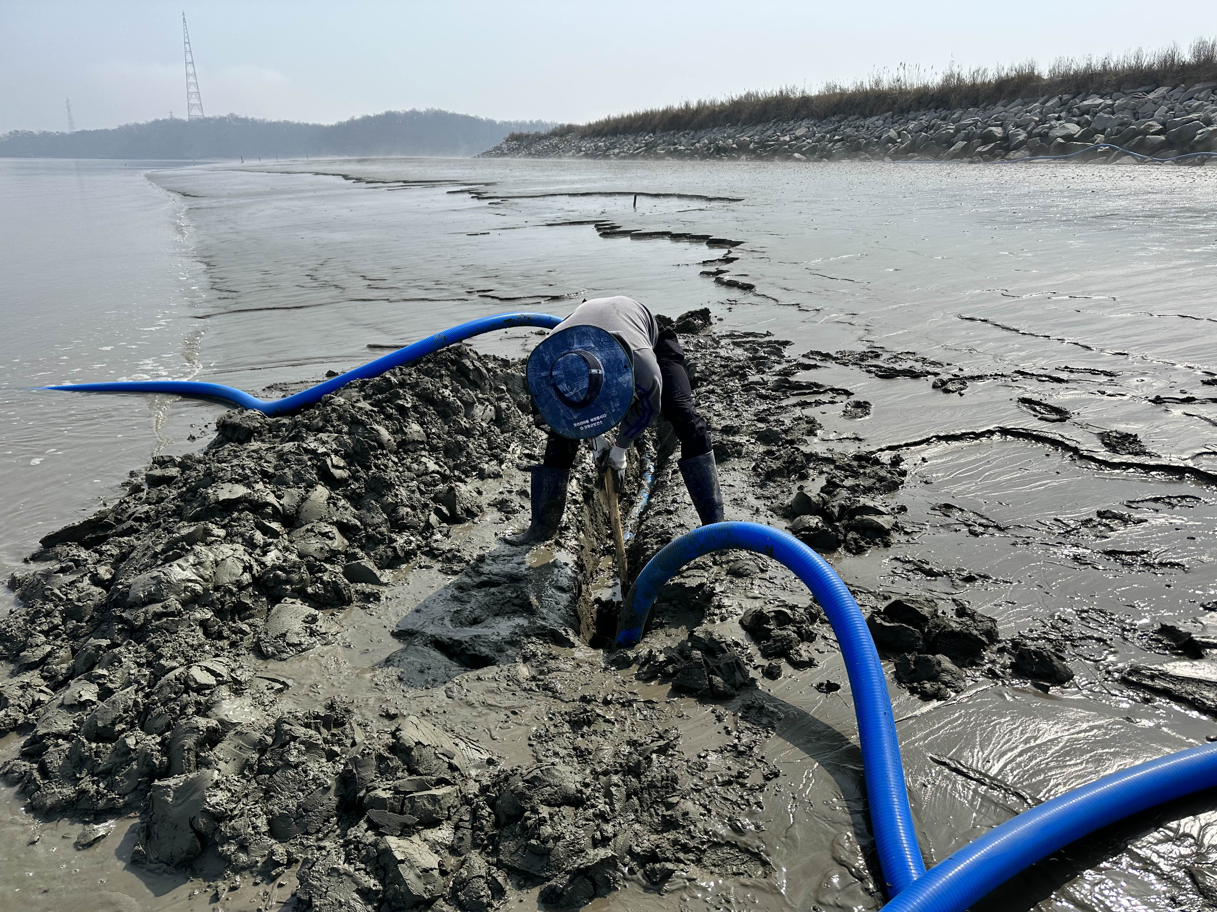 작년에 바다쪽으로 깔아 놓은 75밀리 청고압 호스의 일부가 뻘에 묻혀버려 오늘은 날 잡아 이것을 파 내느라 삽질을 개오지게 했다.